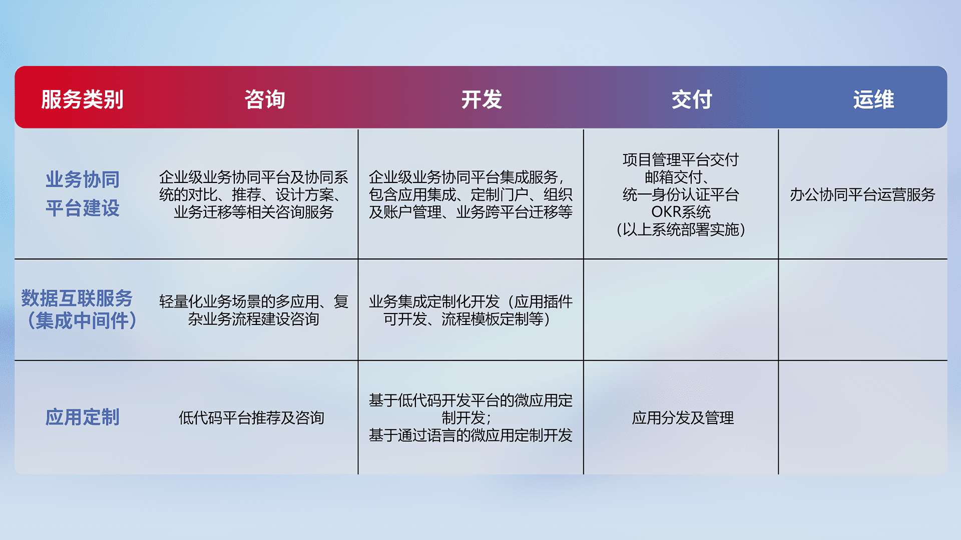 针对钉钉、、、、企微、、、IDaas等平台级产品提供产品的规划、、、、方案、、、交付、、、、定制化开发等服务,,,实现如统一协同办公、、、、智能客户服务、、、、混合会议管理、、、智能数据查询、、、等业务场景,,,,实现数字化转型。。。。
