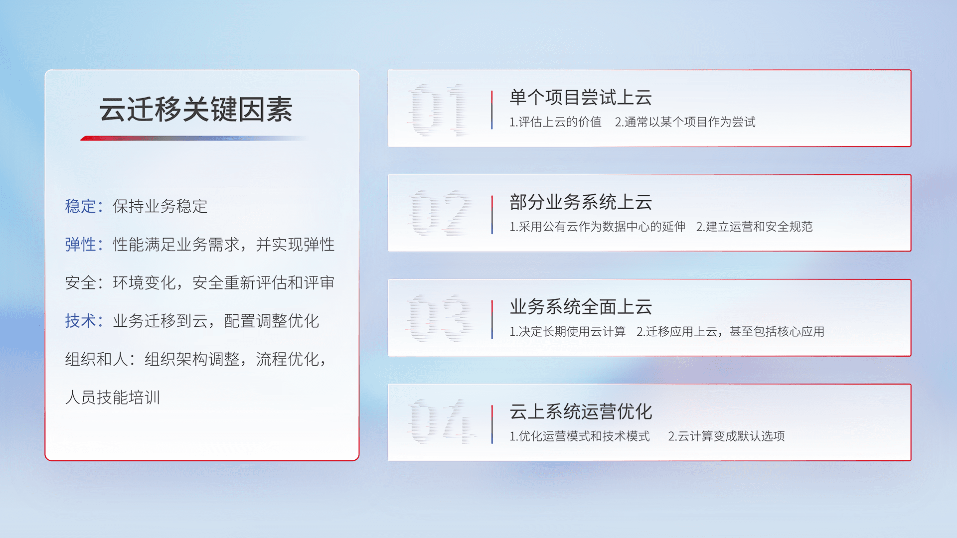 结合实际业务,,,,从规划设计、、、、云平台选型、、云原生改造、、数据迁移、、集成交付,,,,迁移全过程为客户识别最佳上云路径,,,做好风险识别管理,,,设计网络架构、、身份权限、、、、安全审计合规、、操作审计、、、、日志审计、、、监控告警策略、、、、多站点容灾设计等,,对云上基础设施进行整体规划,,,,提升IT治理水平,,,,以满足弹性、、、、高可用、、高性能的需求。。。